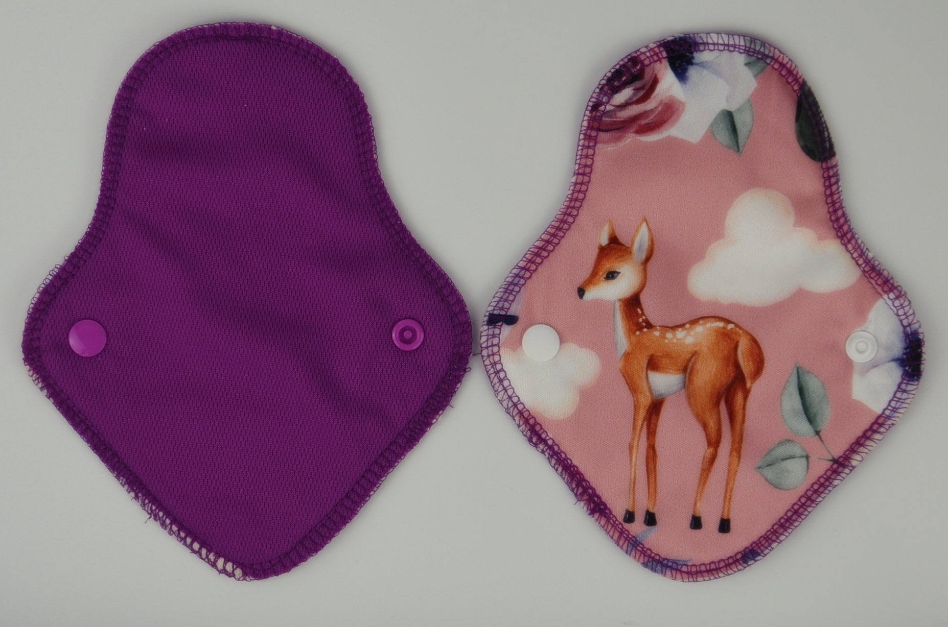 Vékony, de nagy nedvszívó-képességű menstruációs betétek: a test felől egyszínű szárazontartó, hogy ne érezd a nedvességet, és minden foltot könnyedén ki tudj mosni; középen egy réteg 100% biopamut zorb; alul nedvességzáró (mintás vagy egyszínű) pul réteg.18 cm hosszú, és 4,5 cm széles összepatentolva.