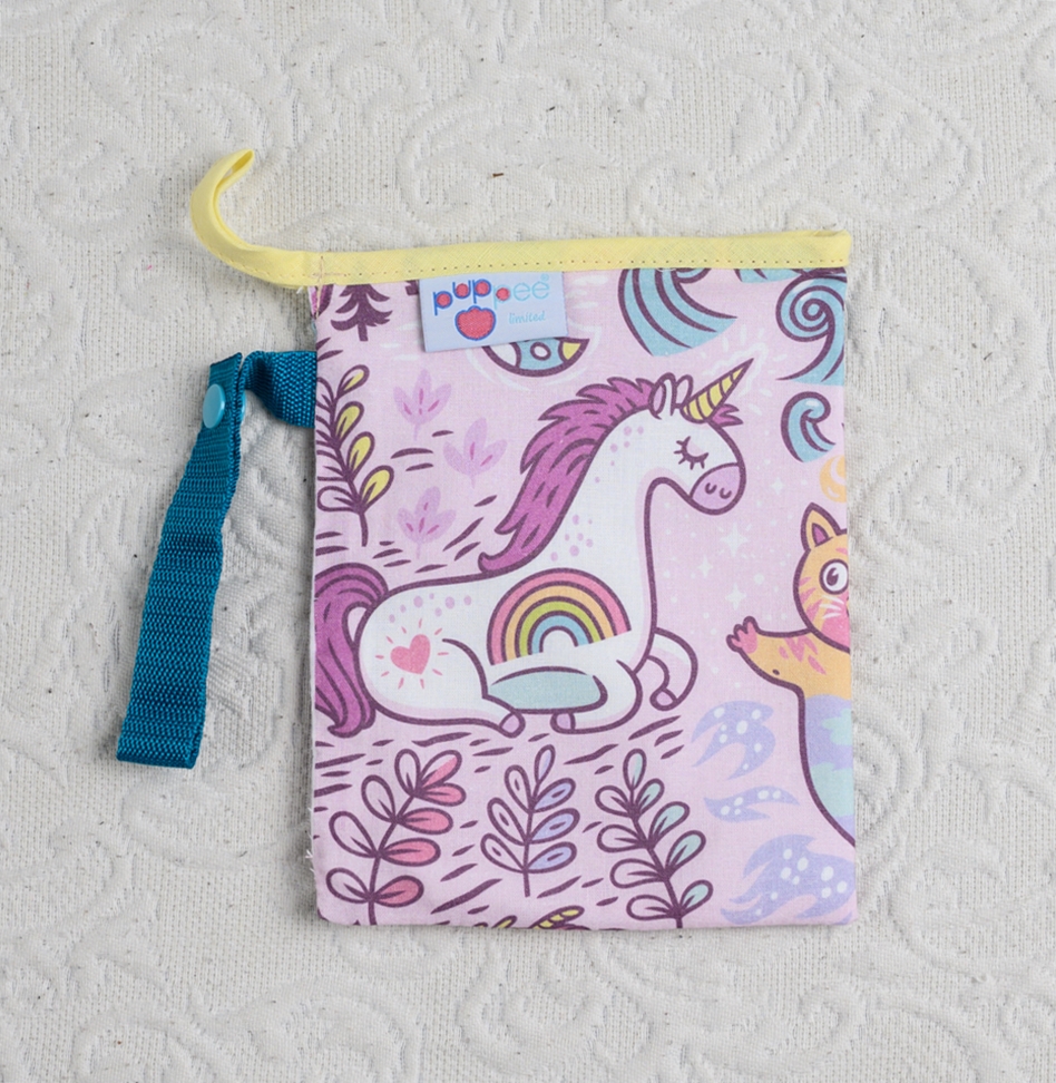 15×20 cm-es kistasak, mely kívül pamutvászon, belül pul, így bármilyen nedves és koszos dolgot tehetsz bele, akár a használt előkéket is. Praktikus akasztóval.