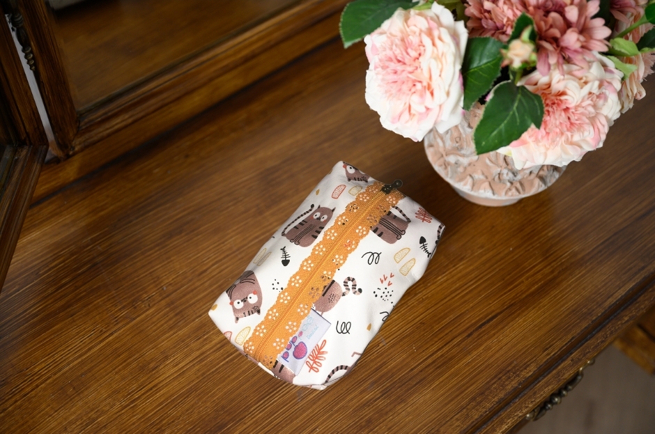 Sokoldalúan használható, praktikus tároló, belül nedvességzáró PUL réteggel. Használhatod tiszta vagy már használt női betétek diszkrét tárolására, kedvenc kozmetikumaid magadnál tartására. 17,5 cm széles, 12 cm mély és kb. 3-4 cm magasságig pakolható.